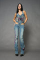 2-in-1 design – convertible denim jumpsuit with detachable top and capri pants Blue faded wash with bold contrast shading  Lace-up detailing along the legs and sides with metal eyelets and ties for perfect individual fit Cropped capri cut hitting mid-calf...